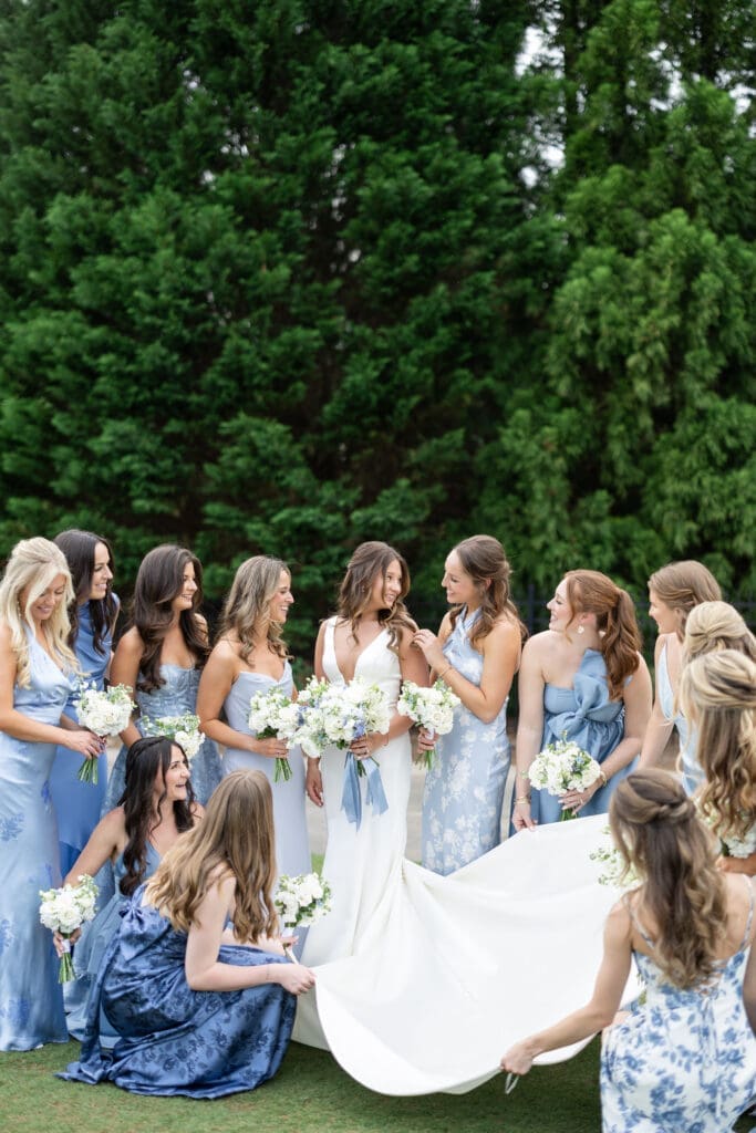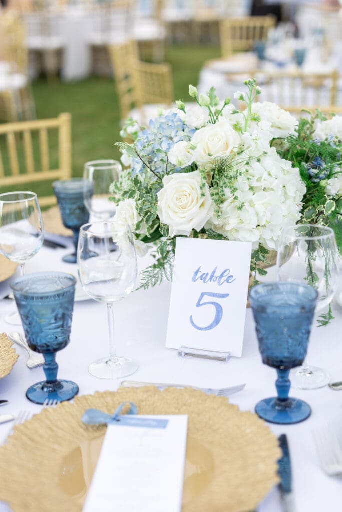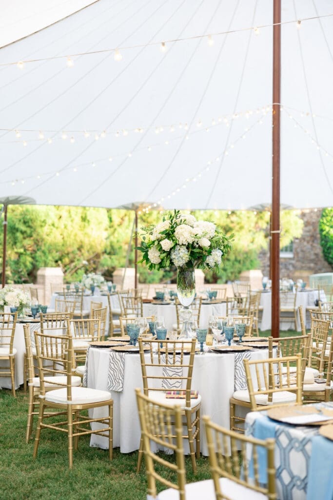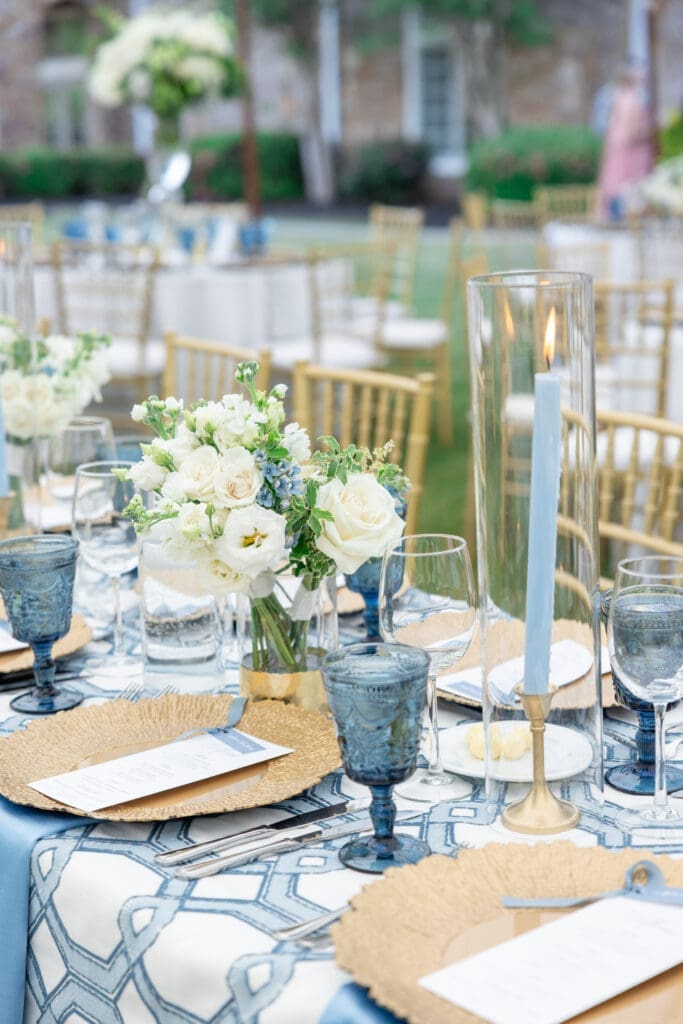 The arrangements were intentionally light and airy, echoing the open feel of the tented reception and the natural landscape beyond. The florals were complemented by gorgeous patterned table linens that added visual interest and softness to the overall design. Textured gold chargers, vintage-inspired blue goblets, and warm gold accents created a layered tablescape that felt curated yet approachable. Soft blue tapers in glass hurricanes added height and a gentle glow as the evening transitioned from day to night.