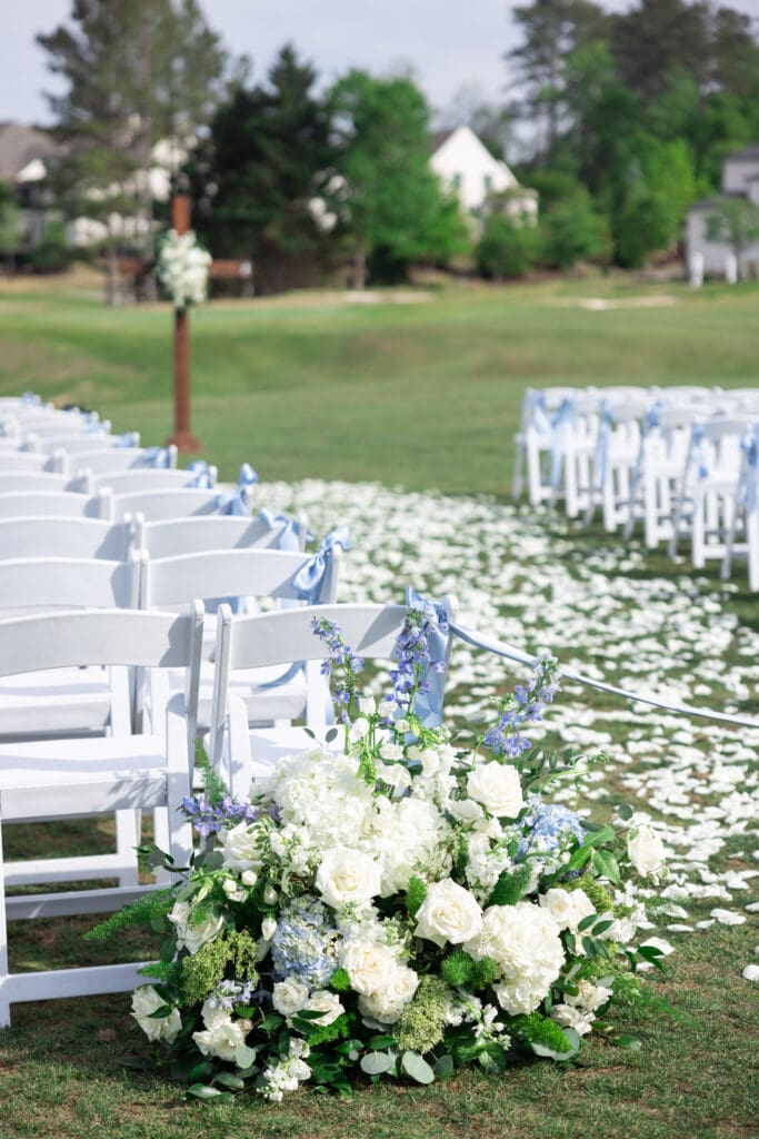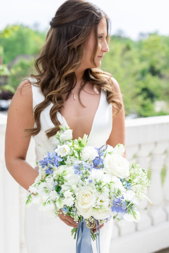 The floral palette centered on soft whites and creams, layered with gentle touches of blue and fresh green foliage. Against the natural light filtering through the sailcloth canopy, the flowers felt especially luminous—romantic without being overly formal.