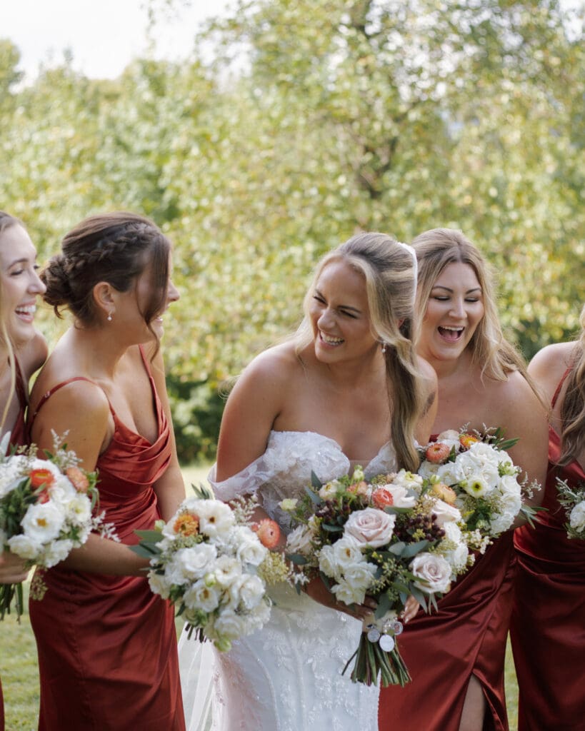 Each bouquet incorporated soft neutral roses, warm autumn florals, and airy greenery, creating a cohesive and timeless bridal party look. The combination of terracotta dresses and romantic neutral florals created a sophisticated fall color palette that photographed beautifully against the vineyard scenery.